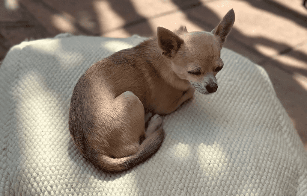 Meadow, chihuahua, odpoczywająca w cieniu na kocu
