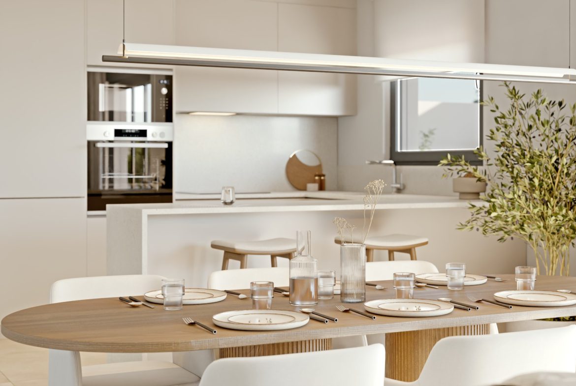 Wnętrza wyróżniają się nowoczesnym designem i układem otwartym, który potęguje wrażenie przestronności. Salon płynnie łączy się z jadalnią i w pełni wyposażoną kuchnią z jasnymi szafkami, eleganckimi blatami z kwarcu i wysokiej klasy sprzętem marki Bosch – idealnym dla miłośników gotowania.