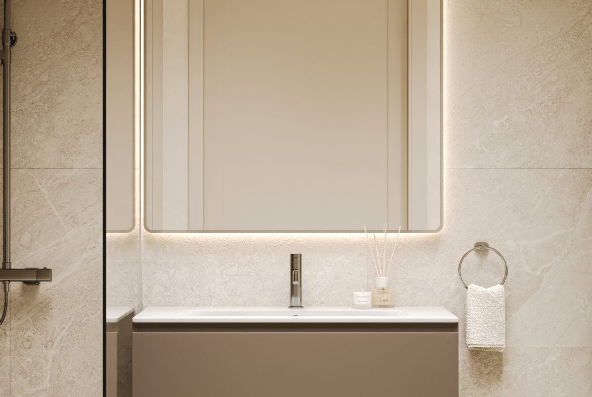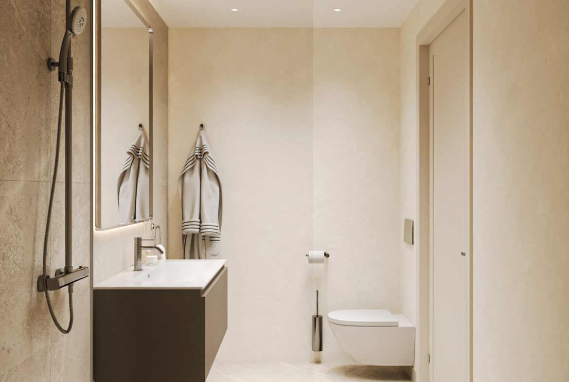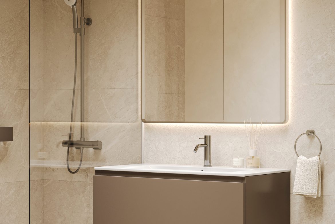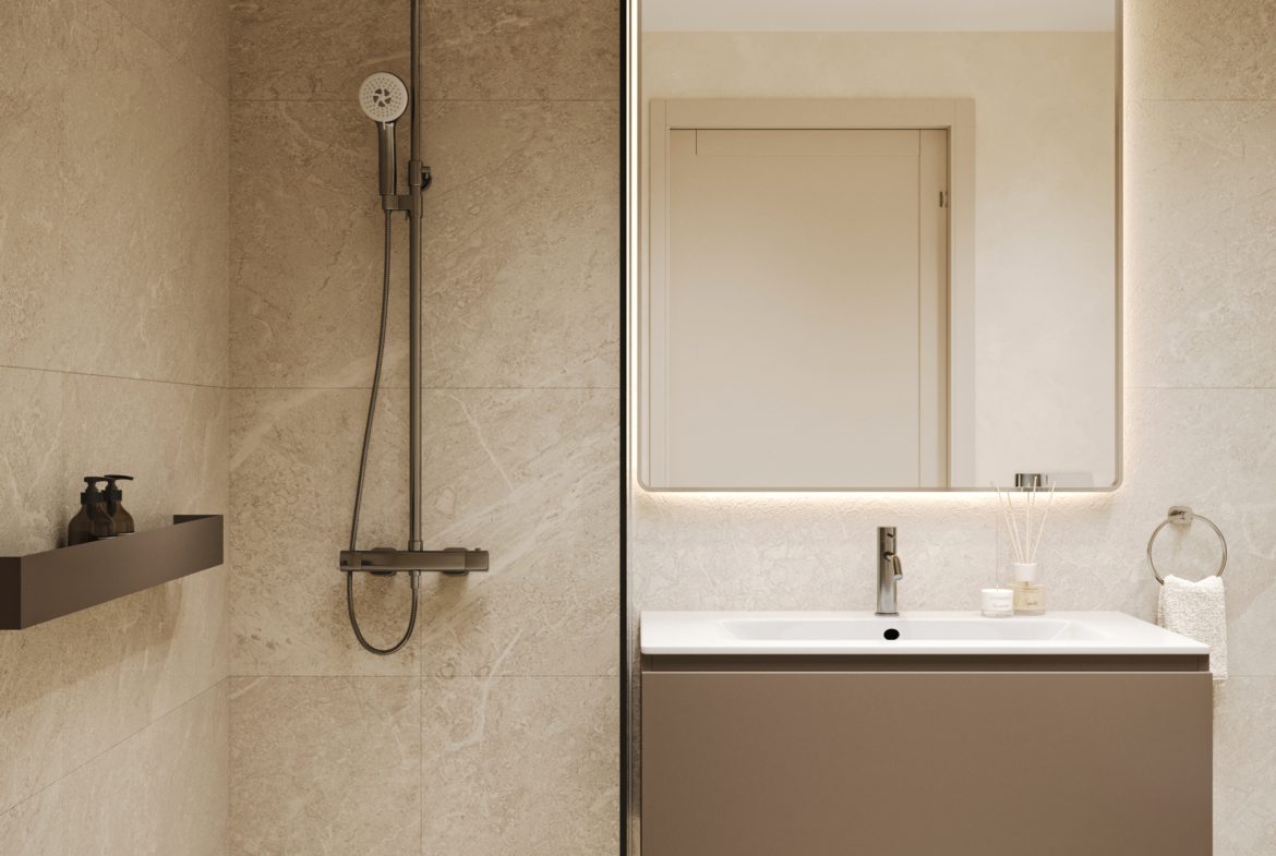 Ergonomiczne układy, duże okna, tarasy i prywatne ogrody w wybranych lokalach. Kuchnie z zabudową premium i sprzętem AGD (m.in. Siemens/Bosch), opcjonalna wyspa, oświetlenie LED. W standardzie: wodne ogrzewanie podłogowe, klimatyzacja z aerotermii, inteligentne sterowanie oświetleniem i klimatem, prysznice walk-in, armatura klasy premium. Dostępne pakiety personalizacji wykończenia.